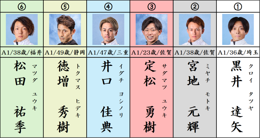 そして⑥松田選手、SG/G1での3連対率が55%を超えていて高いです。これは④井口選手、⑤徳増選手よりも優秀な数値となっていますので、切りにくい。よってここ黒井選手軸の流し。これで行きたいと思います。