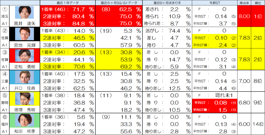 そして⑥松田選手、SG/G1での3連対率が55%を超えていて高いです。これは④井口選手、⑤徳増選手よりも優秀な数値となっていますので、切りにくい。よってここ黒井選手軸の流し。これで行きたいと思います。
