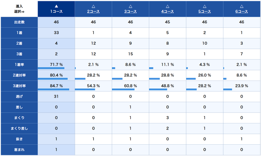 これ見てみると、一つ大きな特徴として、②~⑤号艇まで2連対率に大きな差がないんですよね。ほぼ変わらない数値が並んでいることが分かります。