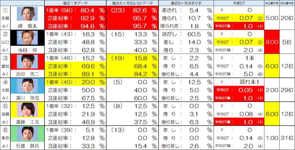 馬場選手のコース実績は高く、SG/G1での2連対率は57.9%と高いです。三日目ということでST決めることが出来れば、二着は全然あると思います。