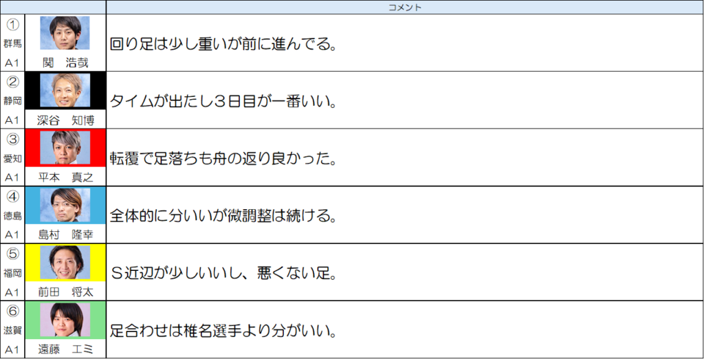 まず2深谷選手は今節の舟足はここまでそこまで目立ったものではなく、着も取れていません。三日目は⑥遠藤選手の方が良く見えました。また、STは良いもののST順がやや悪く、不安です。