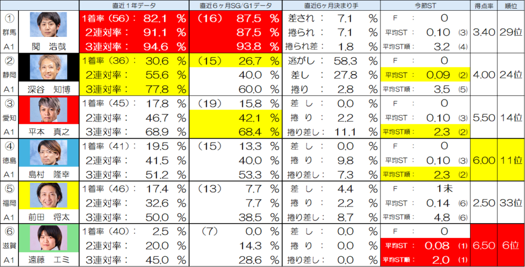 まず2深谷選手は今節の舟足はここまでそこまで目立ったものではなく、着も取れていません。三日目は⑥遠藤選手の方が良く見えました。また、STは良いもののST順がやや悪く、不安です。