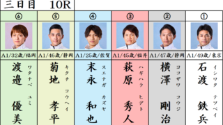 10R買い目 本線:3-145-145 抑え:4-135-135 出走表 今回のメンバーはこちら。 選手データ 買い目考察:本線 本線は3-145-145。 このレースはインの石渡選手、SG/G1での勝率は50%と低い。インが負けることを考...